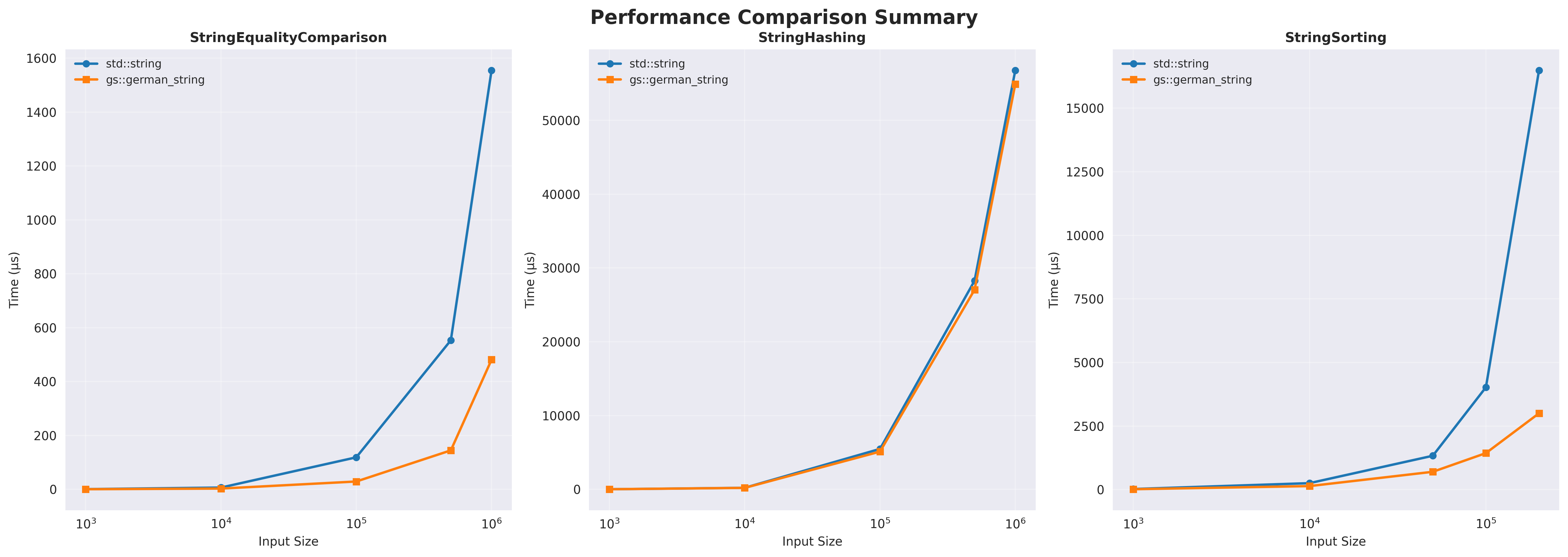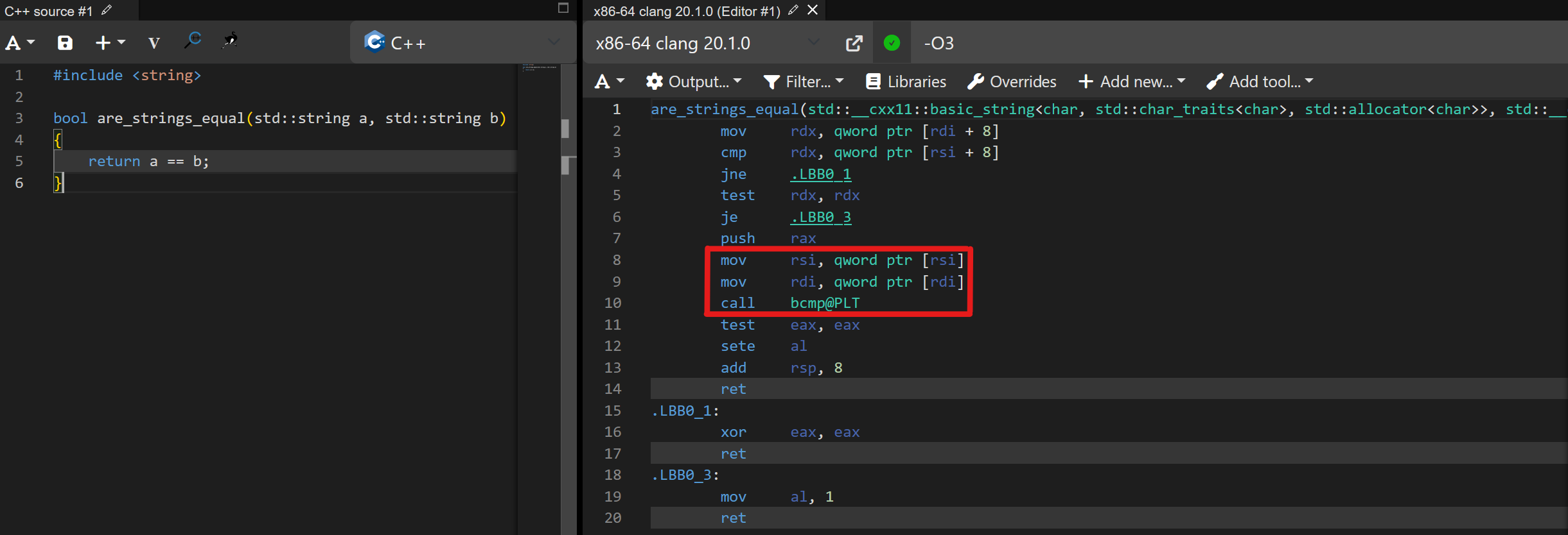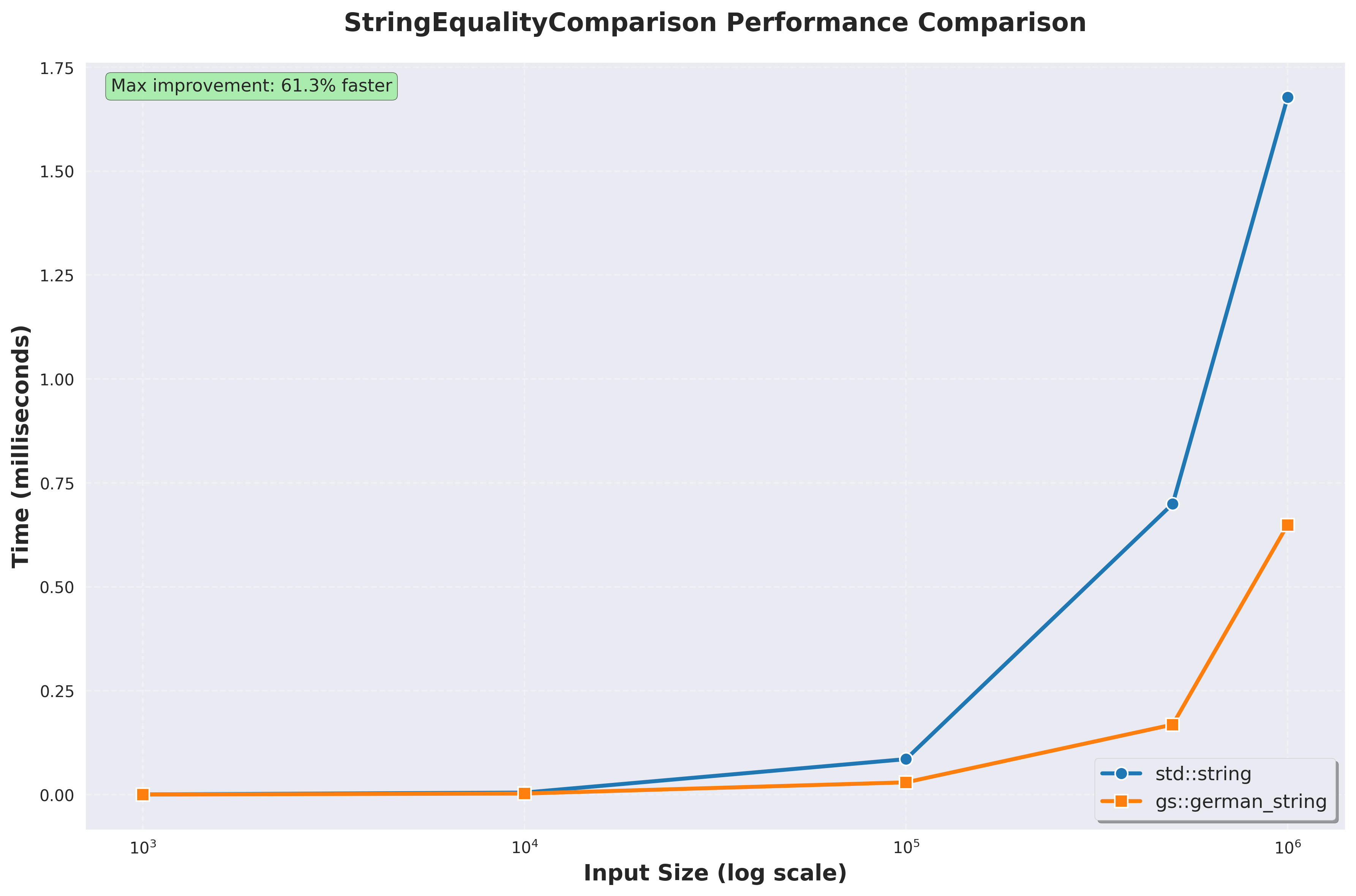note: We check the size but then basically get the data pointers and call memcmp. For the case of a non-small string it might be bad.